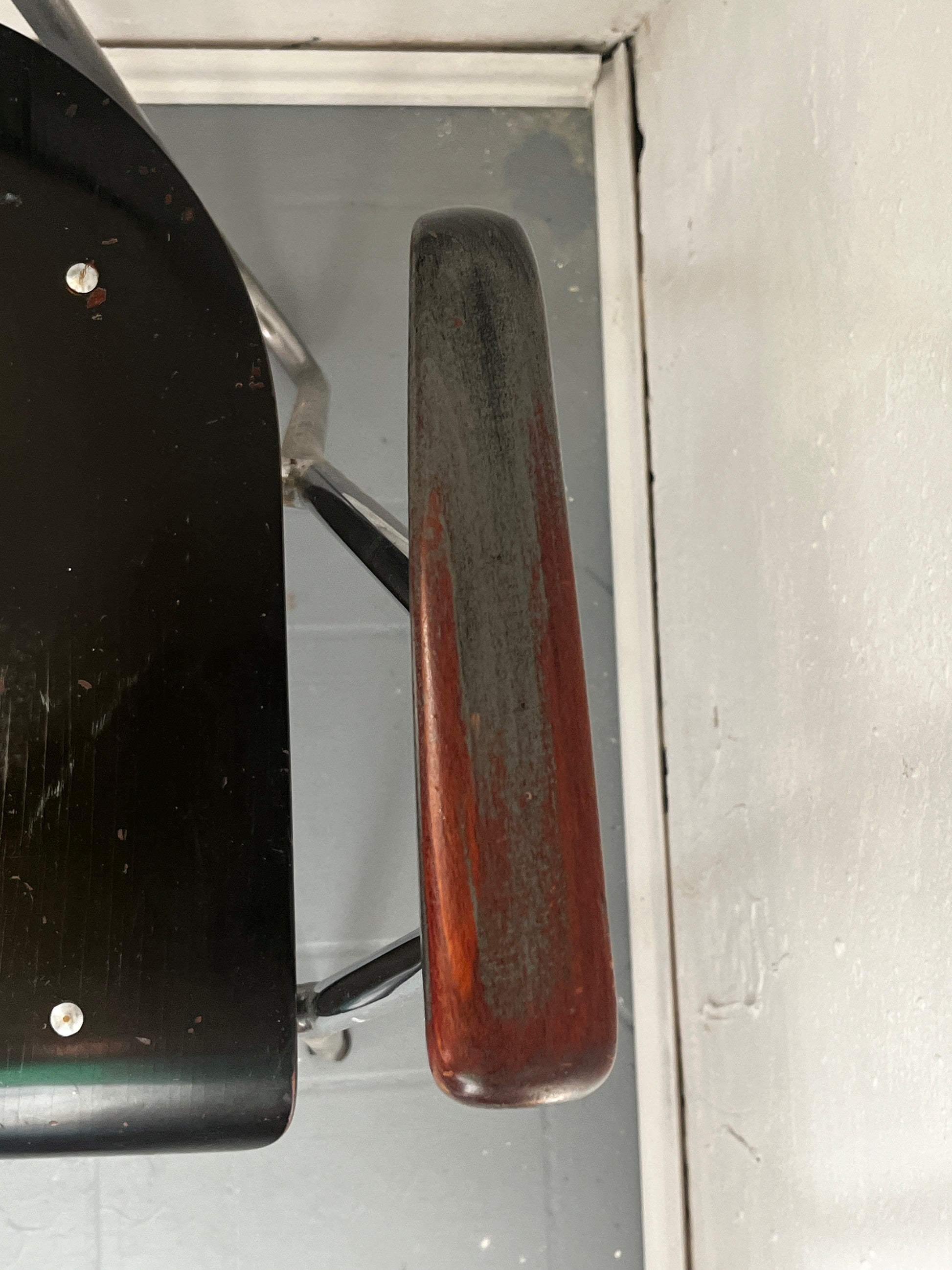 - Holzarmlehnen mit Abplatzungen, Farbabrieben und natürlicher Alterung