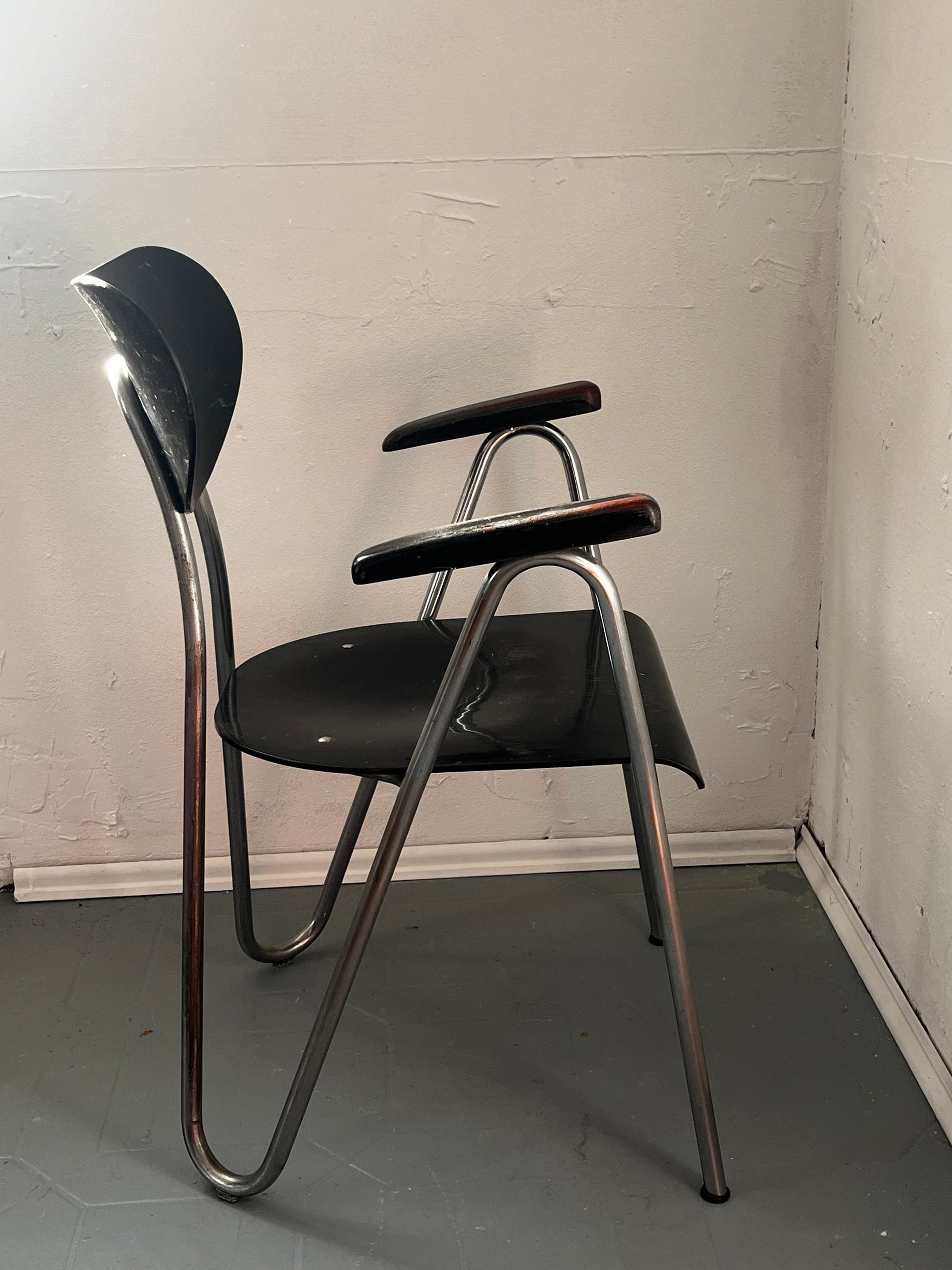 Stahlrohrgestell in charakteristischer Bauhaus-Tradition, kombiniert mit Holzarmlehnen. Die klare, funktionale Formgebung zeigt deutlich den Einfluss von Mies van der Rohes Stahlrohrmöbeln, interpretiert durch Karl Ottos eigenständige Handschrift. Auf der Rückseite mit originaler Herstellerkennzeichnung Arnold.