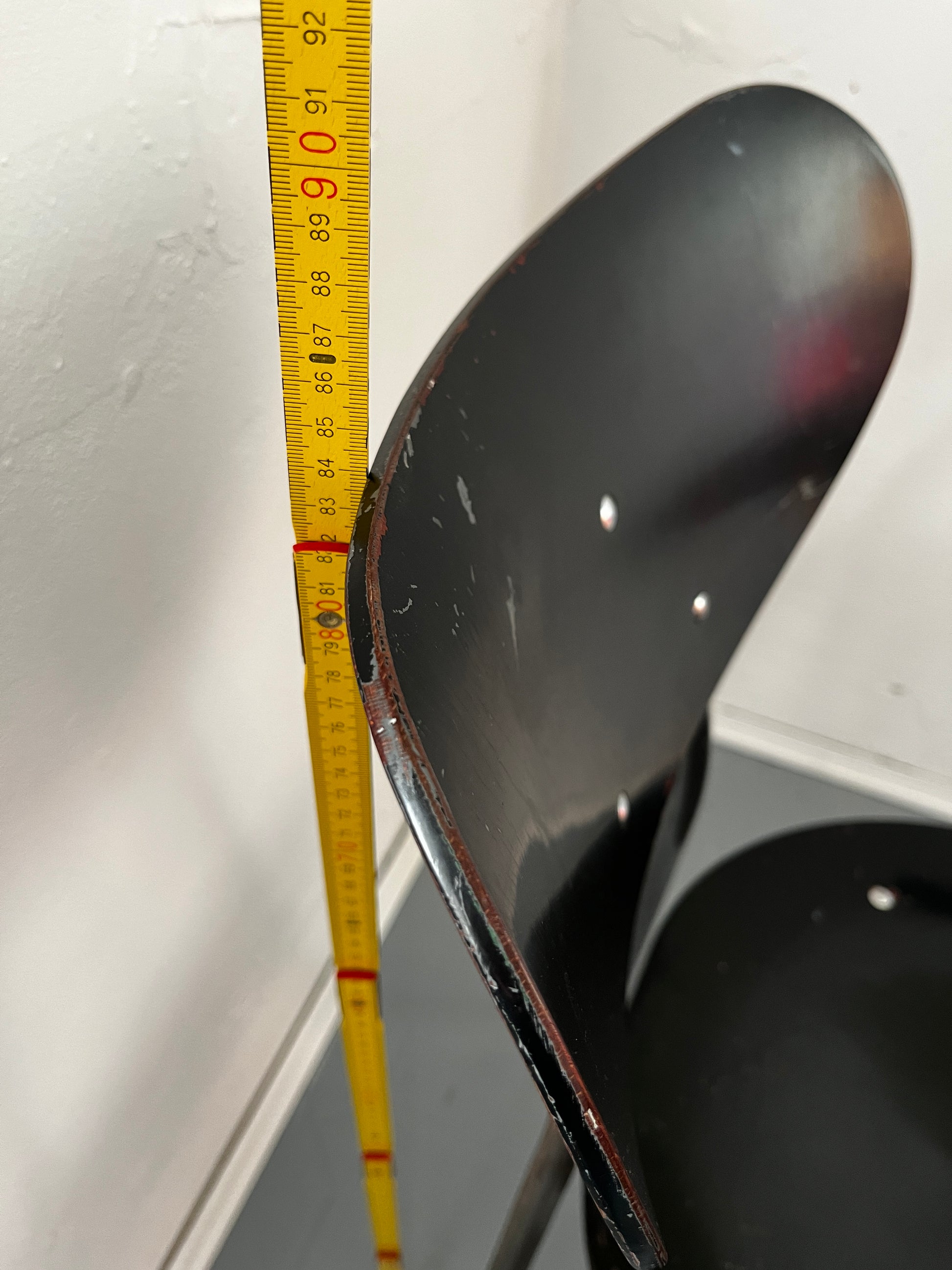 - Holzelemente überwiegend in schwarzer Farbe, Sitzfläche auf der Unterseite grau (möglicherweise Grundierung oder ursprüngliche Farbgebung)