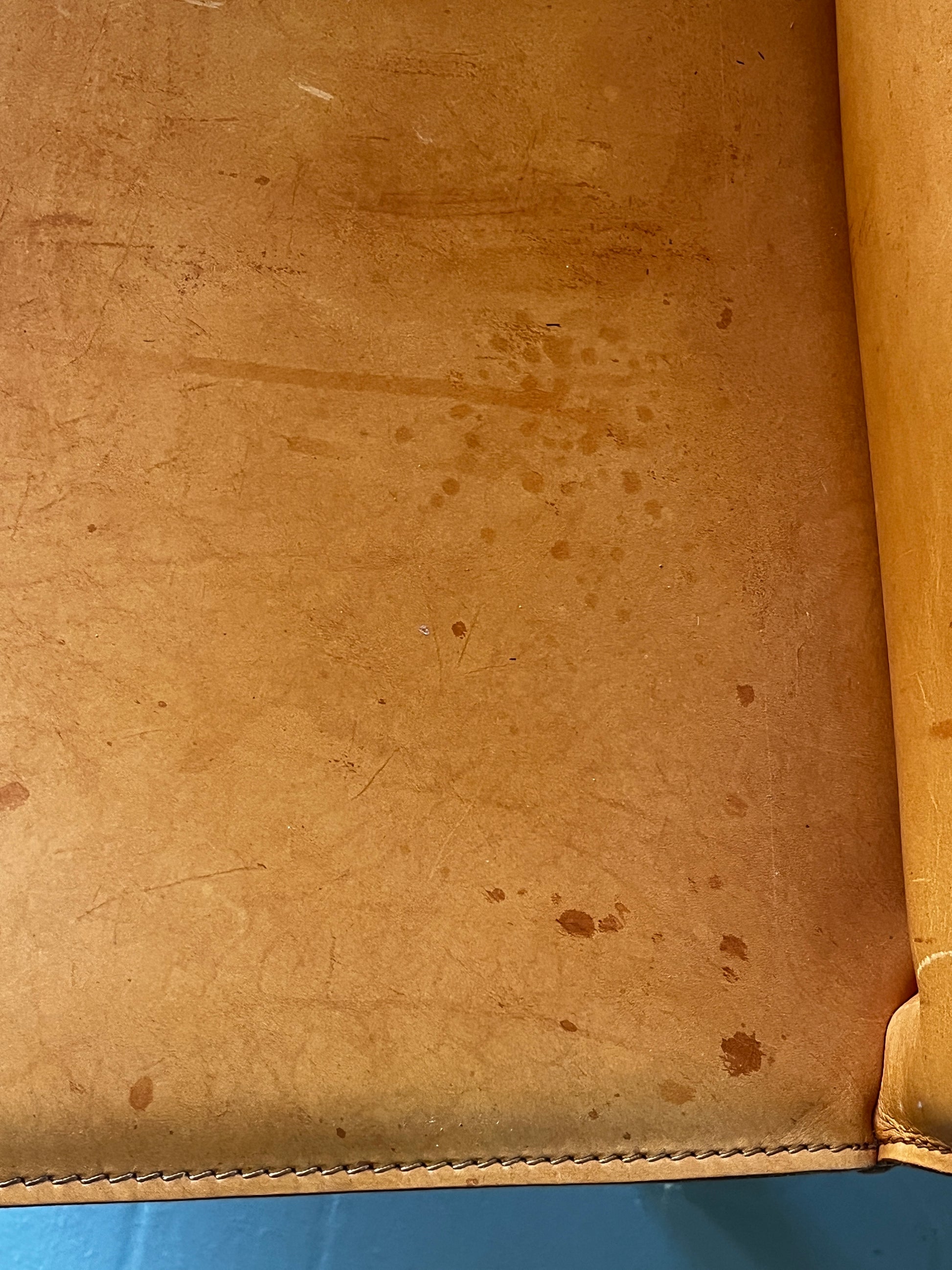 Vintage Design Sessel von Mario Bellini für Cassina. Hellbraunes Leder mit Gebrauchsspuren und teilweise Farbabbleichungen. Stabiler Zustand, auf der Unterseite der Sitzfläche gemarkt.