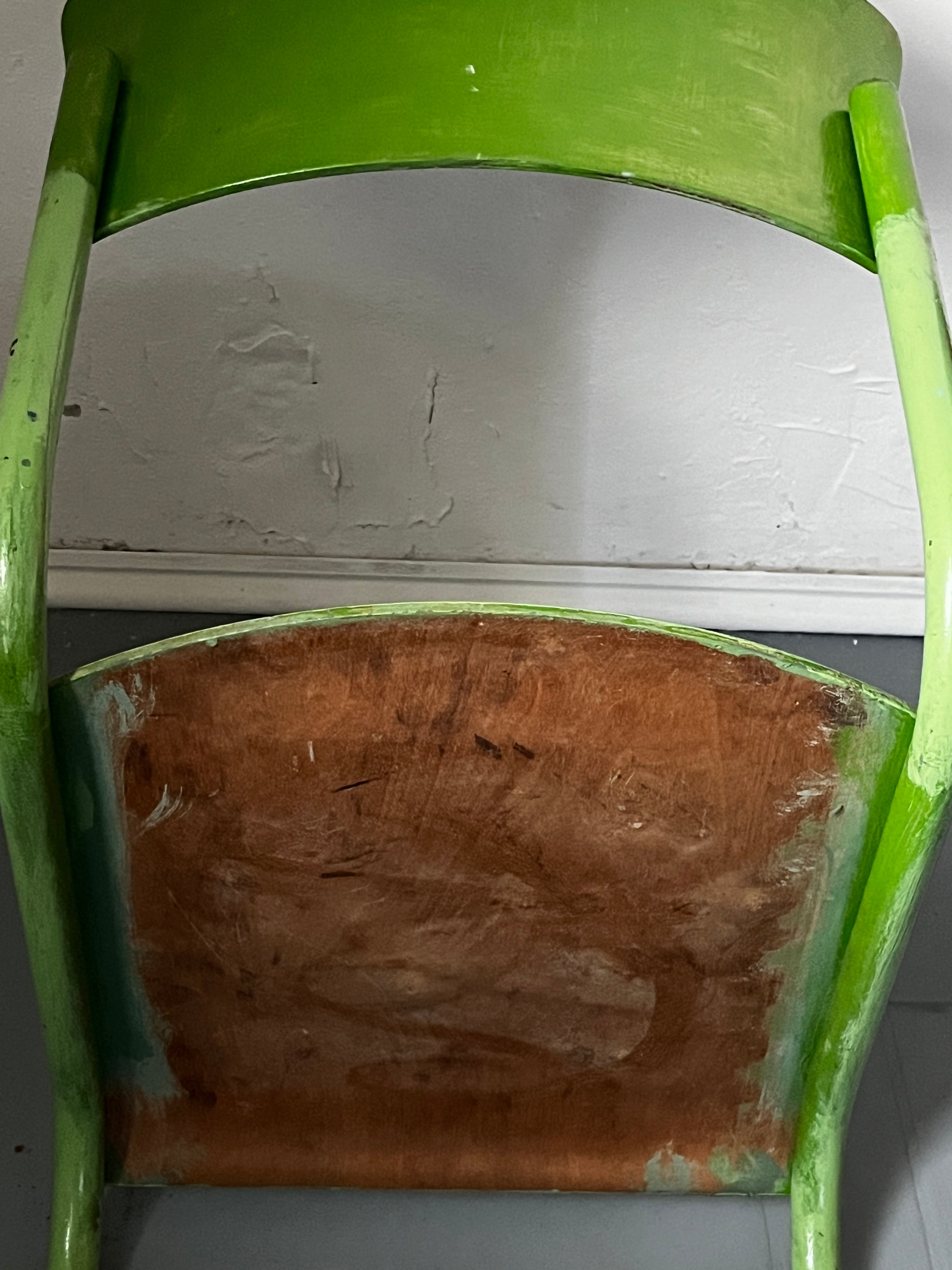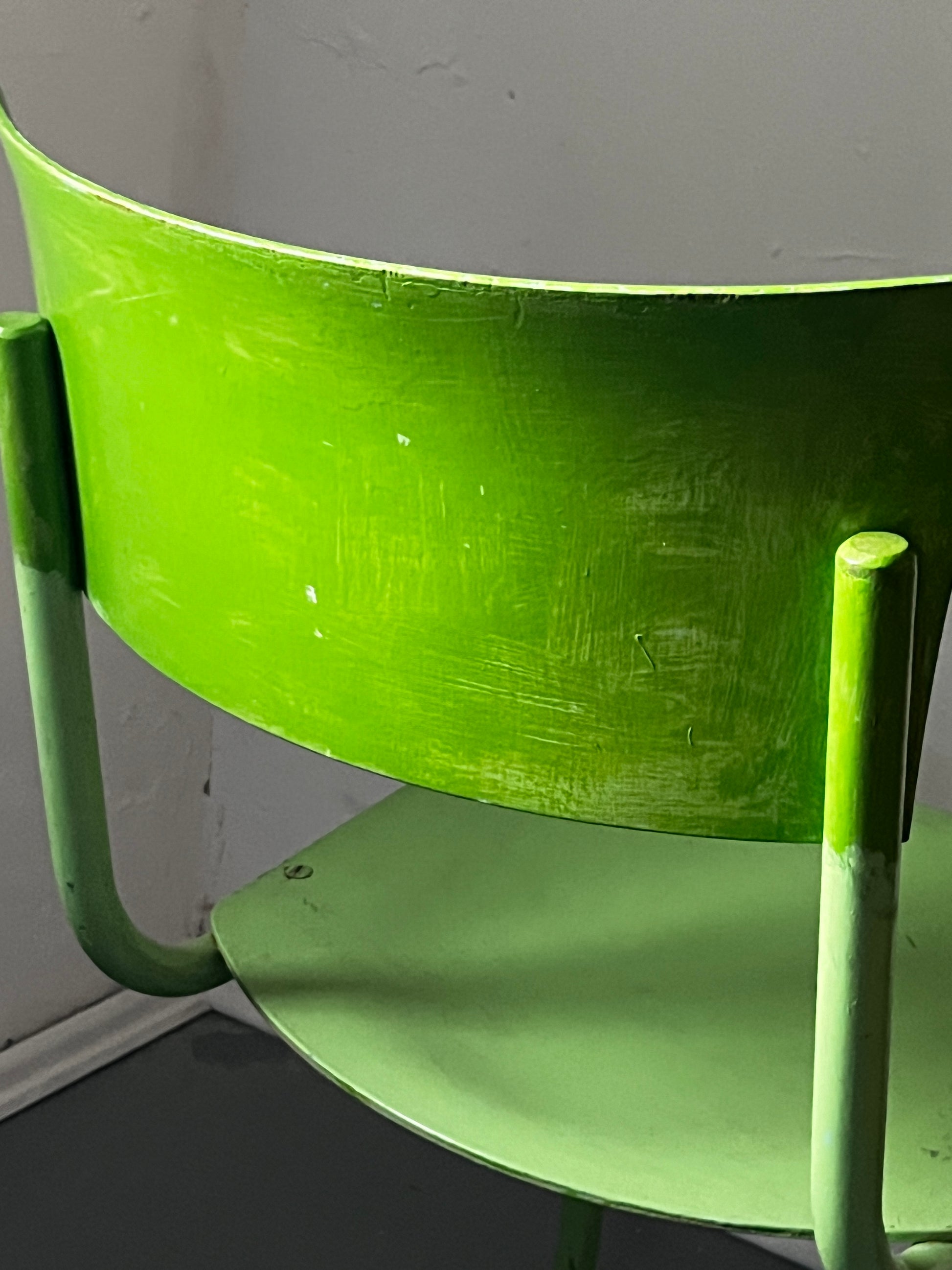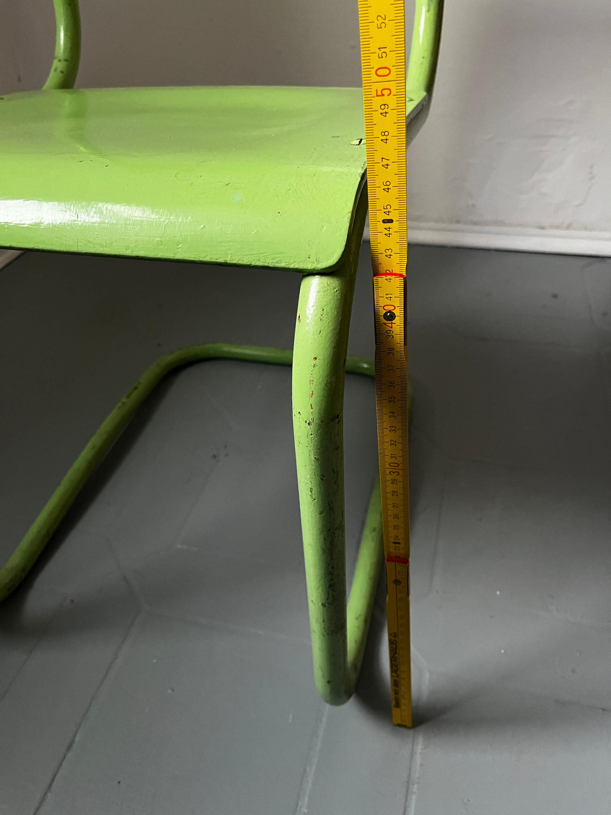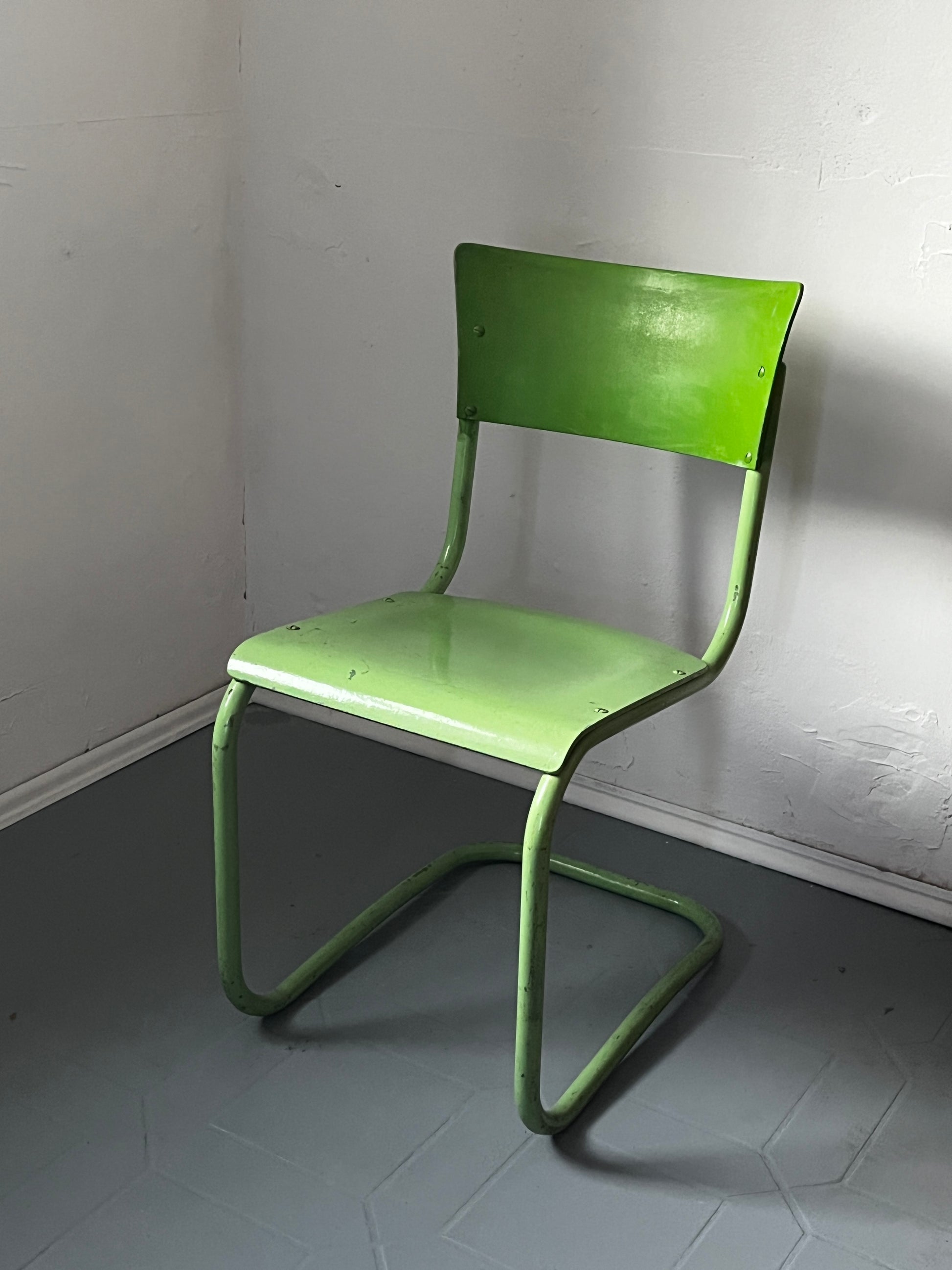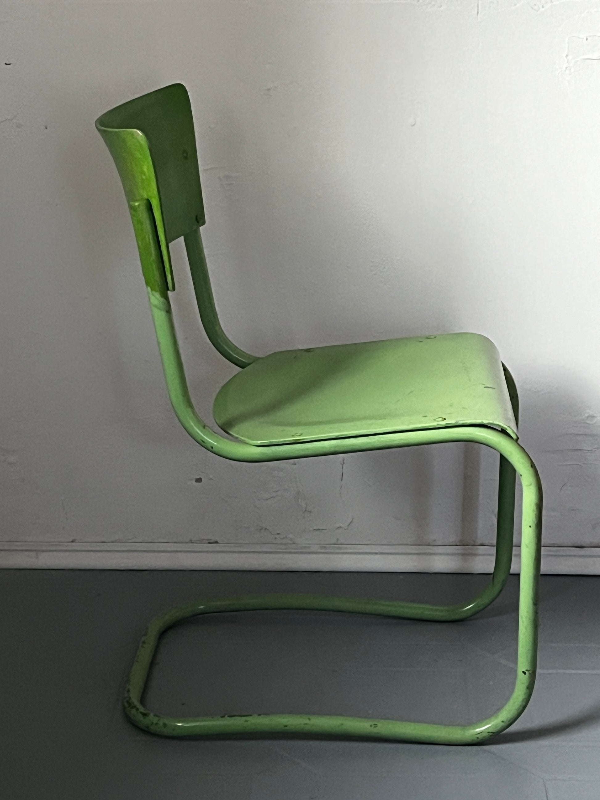 Authentischer Stahlrohr Freischwinger der Bauhaus-Ära in Grün. Der Sessel wurde im Laufe seiner Geschichte mehrfach gestrichen - an Abriebstellen und Kanten sind ältere Farbschichten sichtbar, was ihm einen charaktervollen Vintage-Look verleiht.