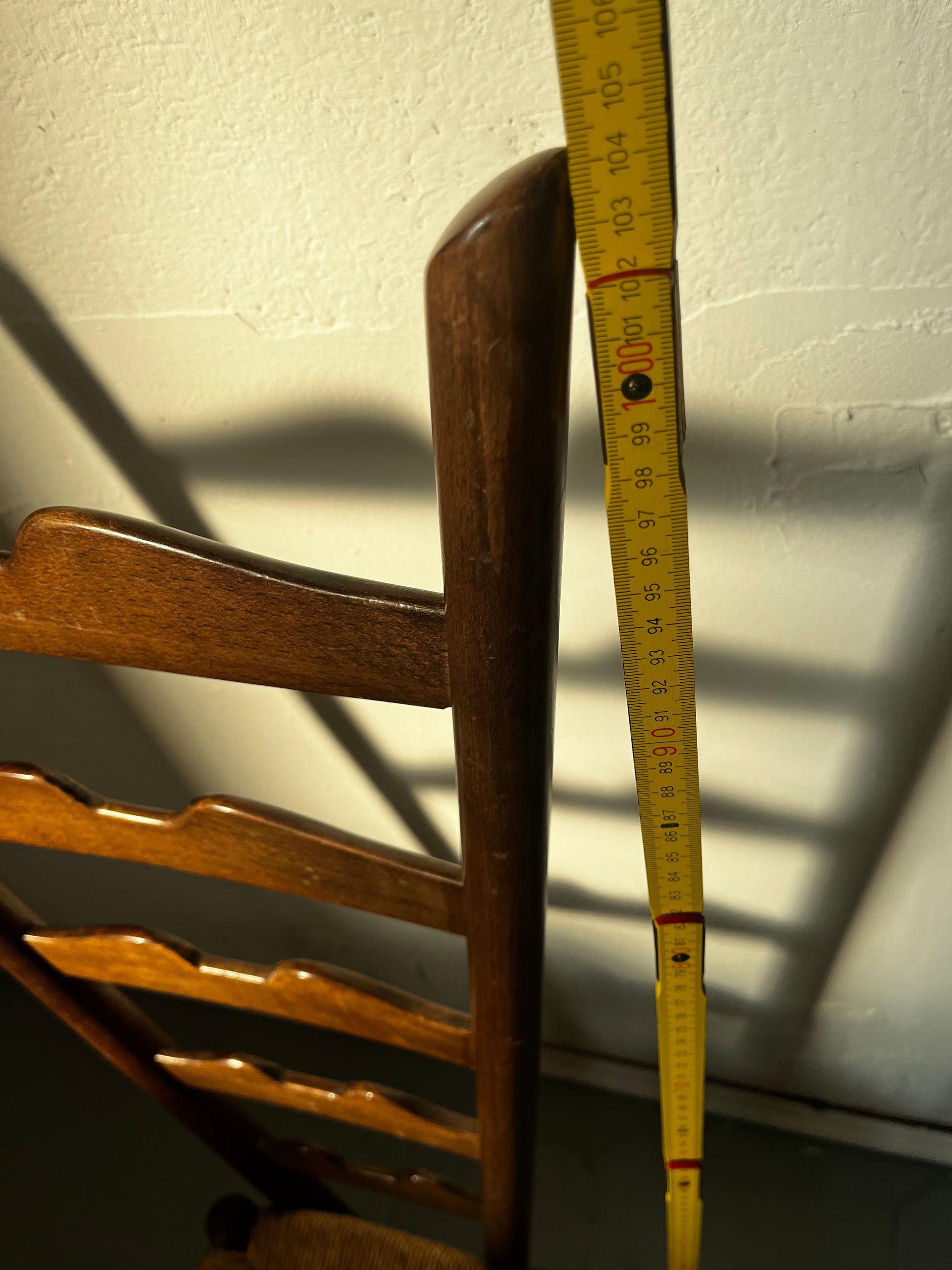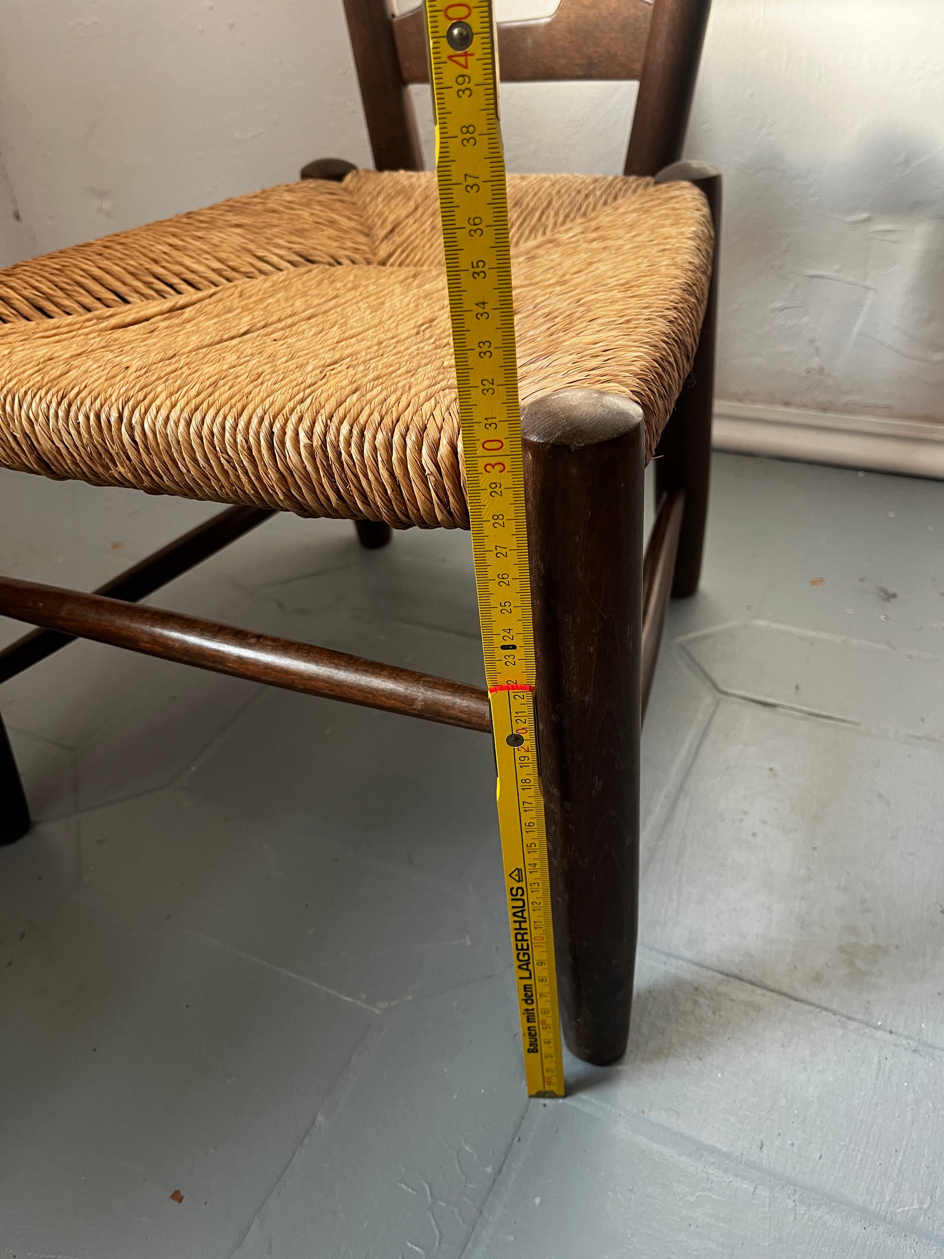 Fireside armchair, high-backed. Used condition, a small hole is present in one of the crossbars (woodworm? / as pictured). Fading and signs of wear are present.