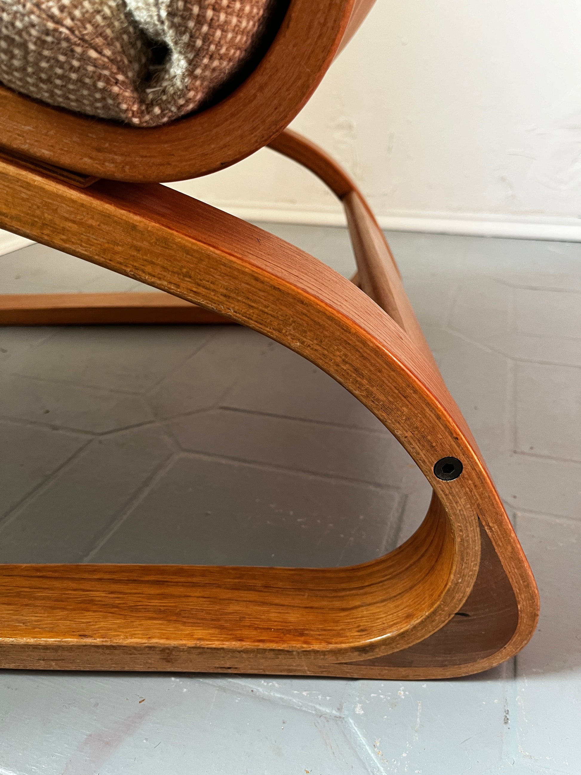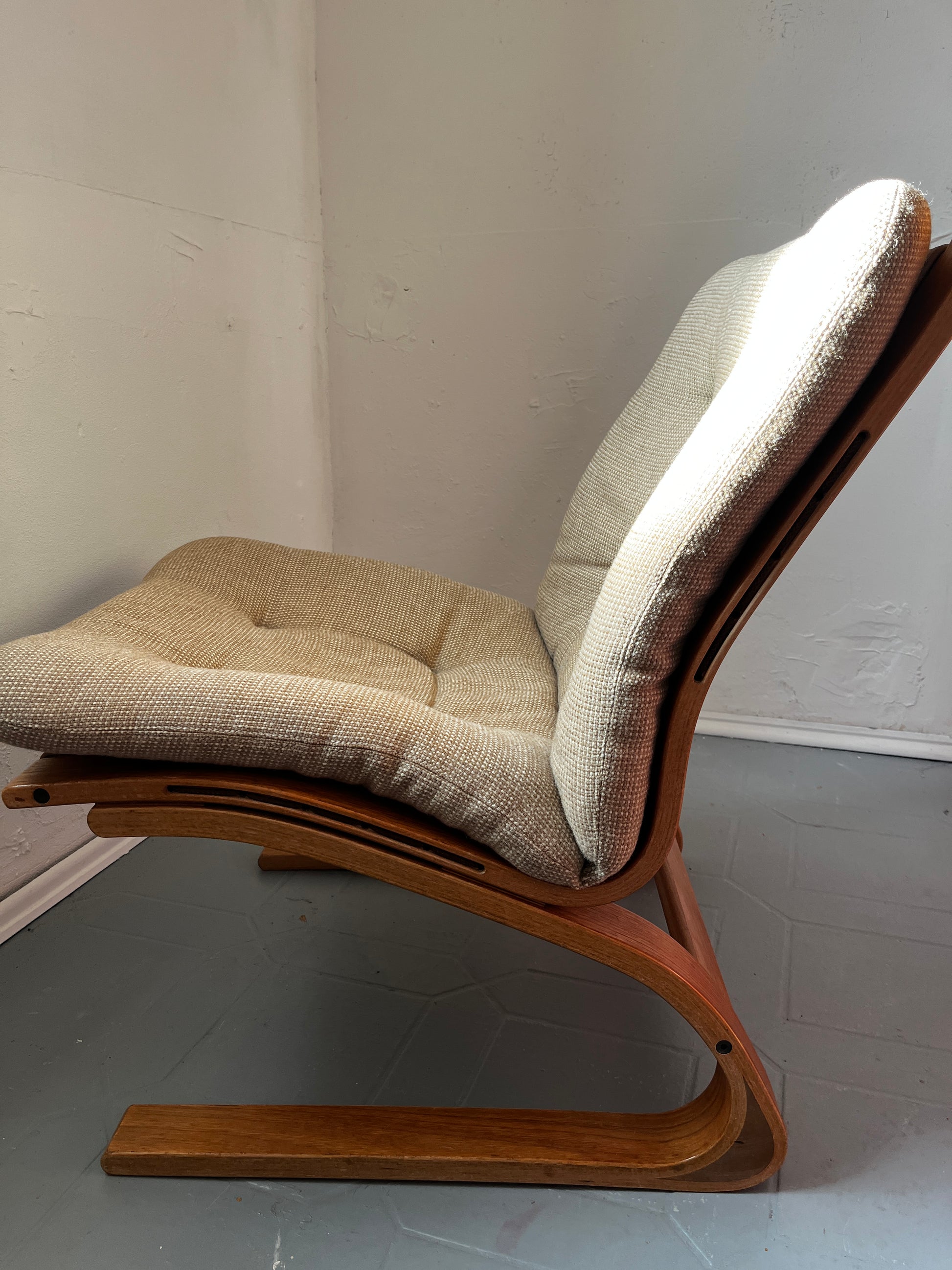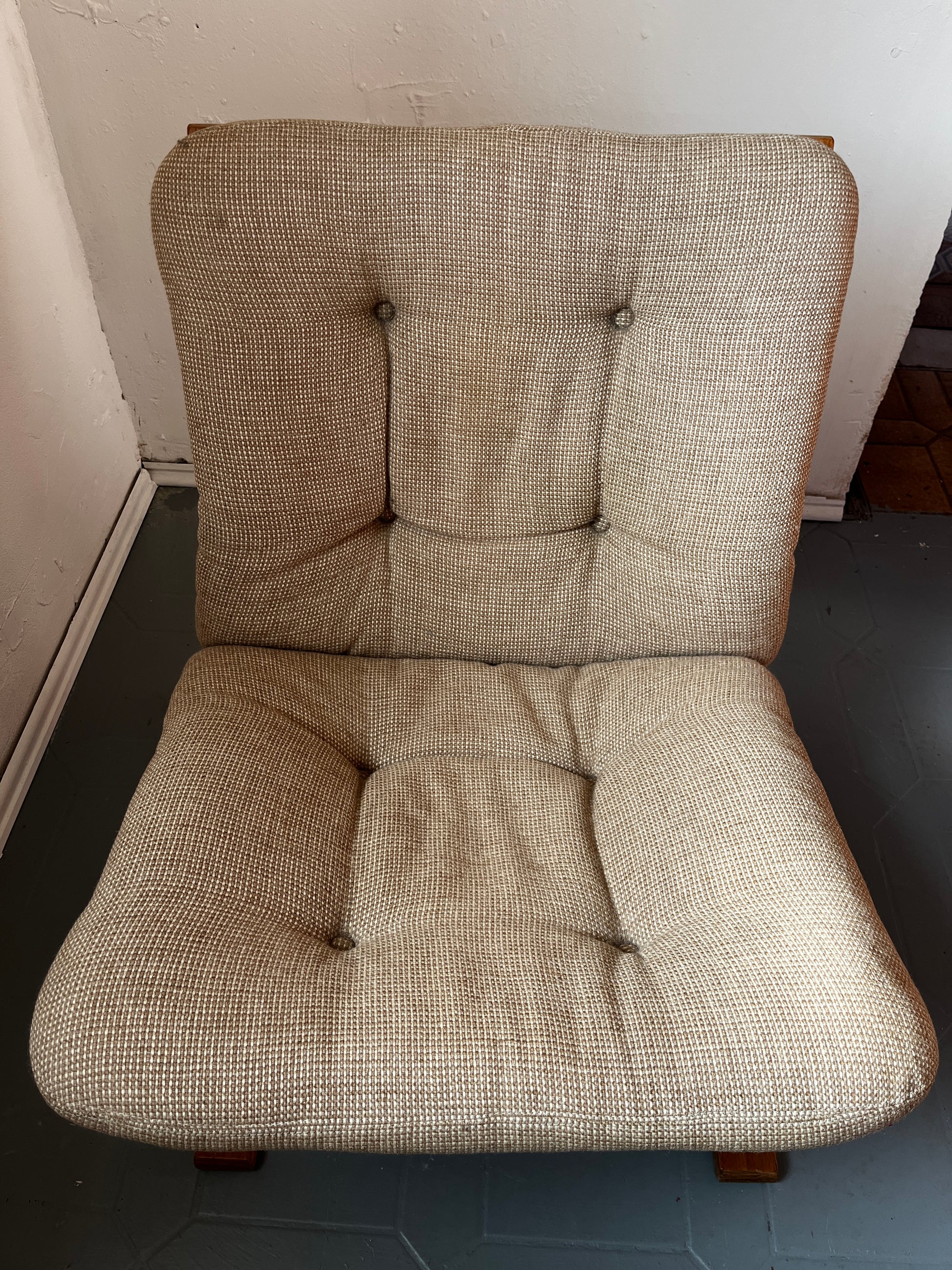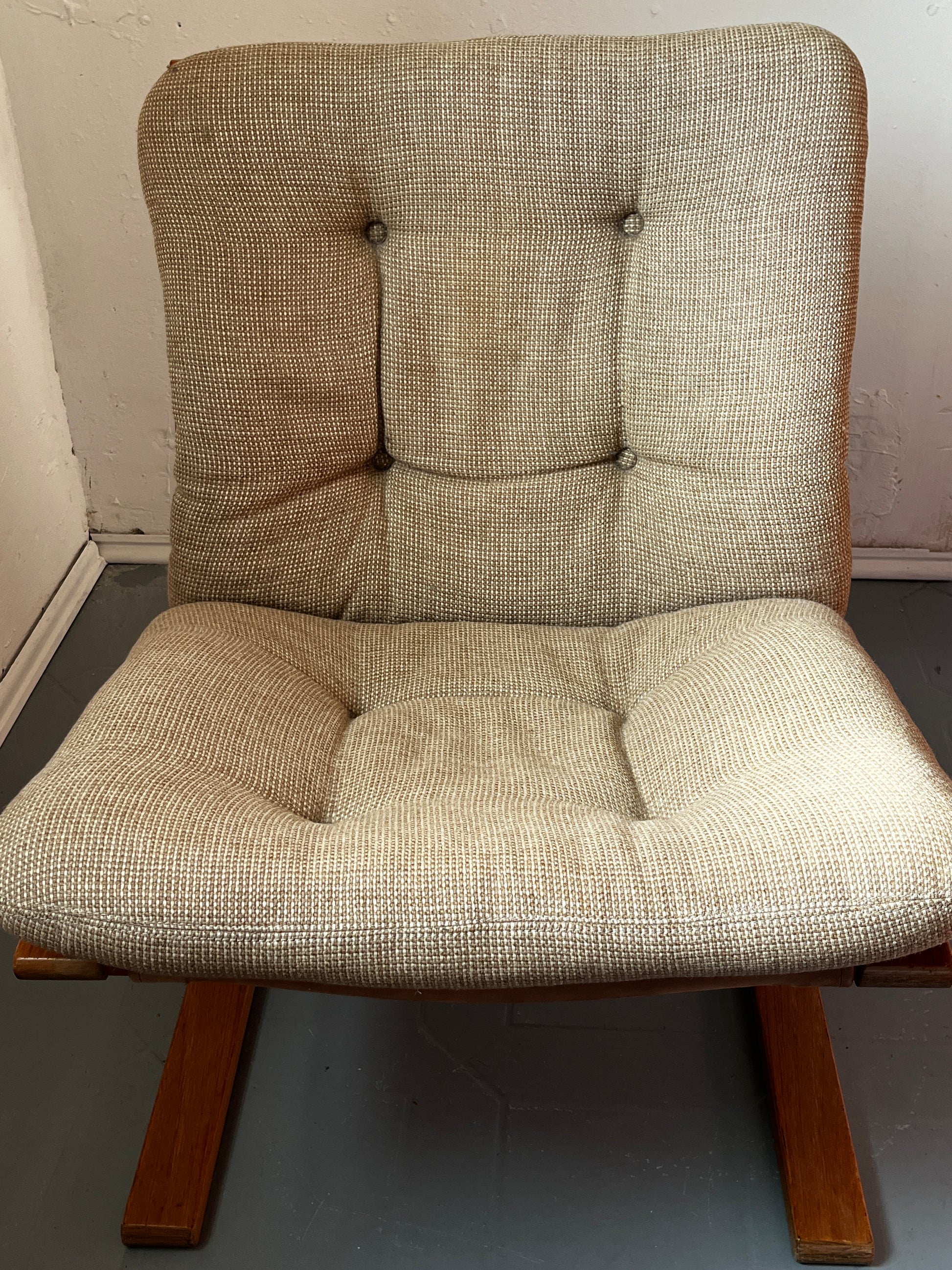 Vintage Design Lounge Sessel Elsa & Nordahl Solheim für Rybo Rykken mit Textilbezug. 1970er bis 1980er, Gebrauchsspuren am Holz und Farbaubleichungen sind vorhanden, auf der Unterseite ist der Sessel gemarkt.