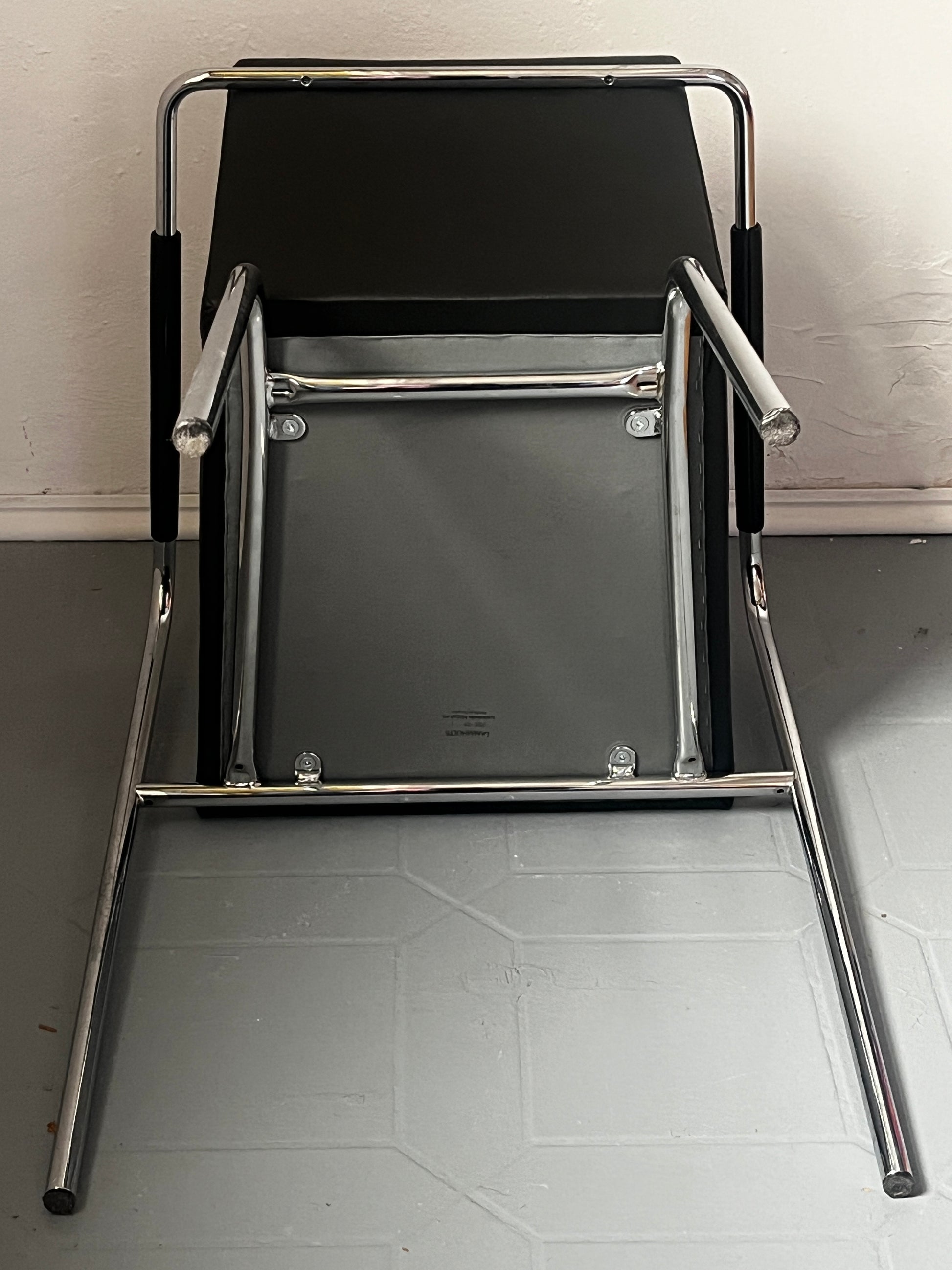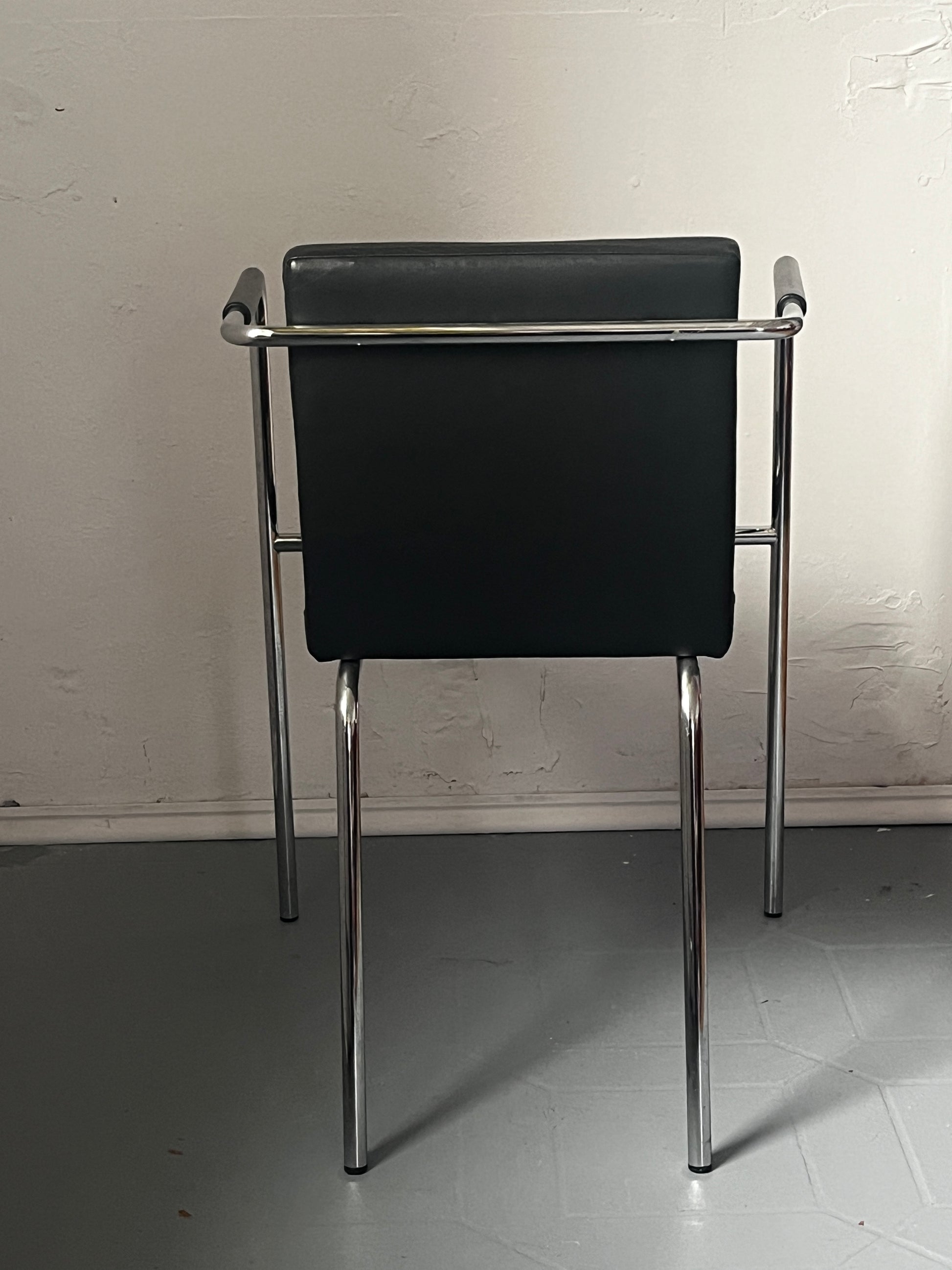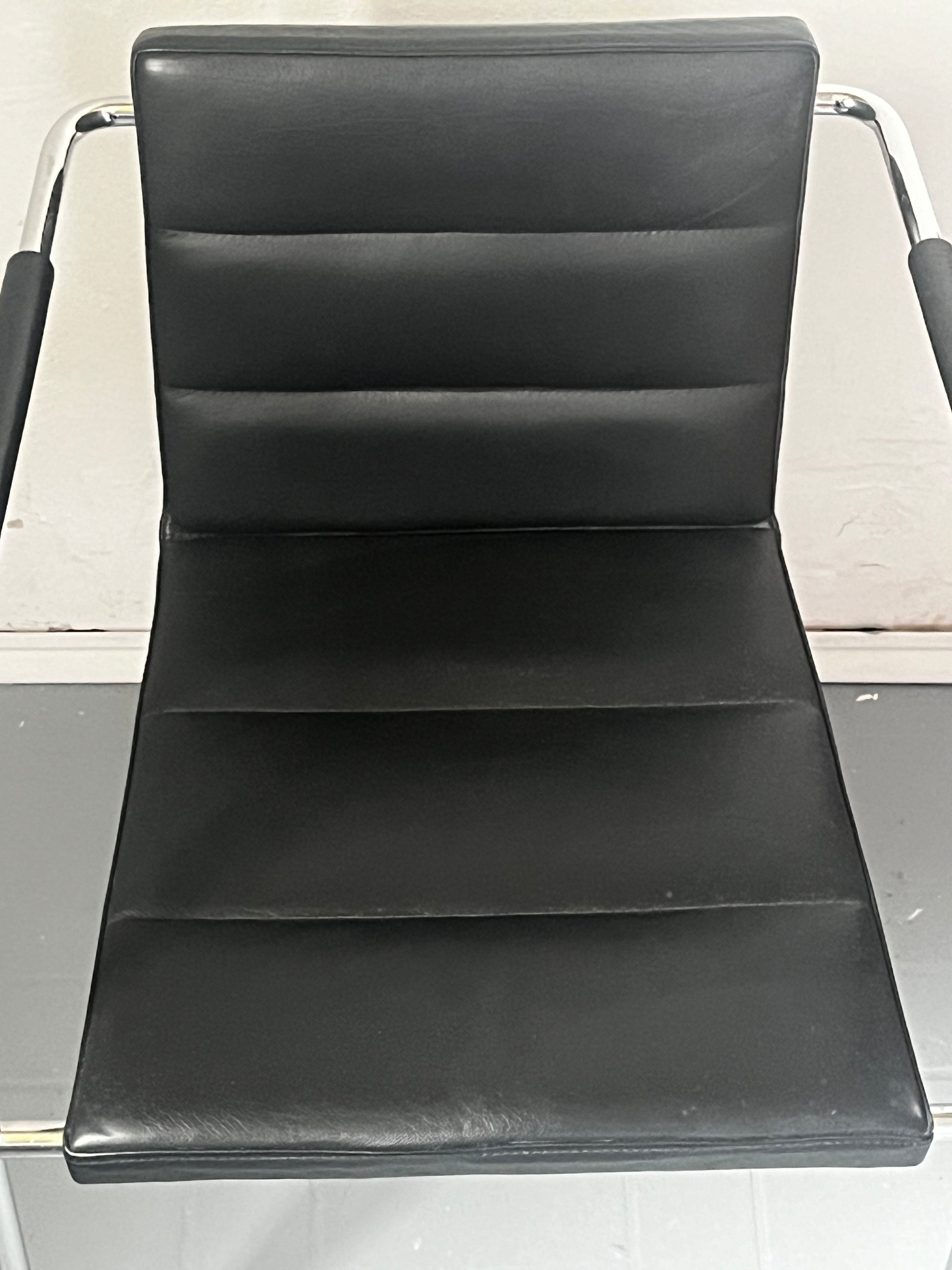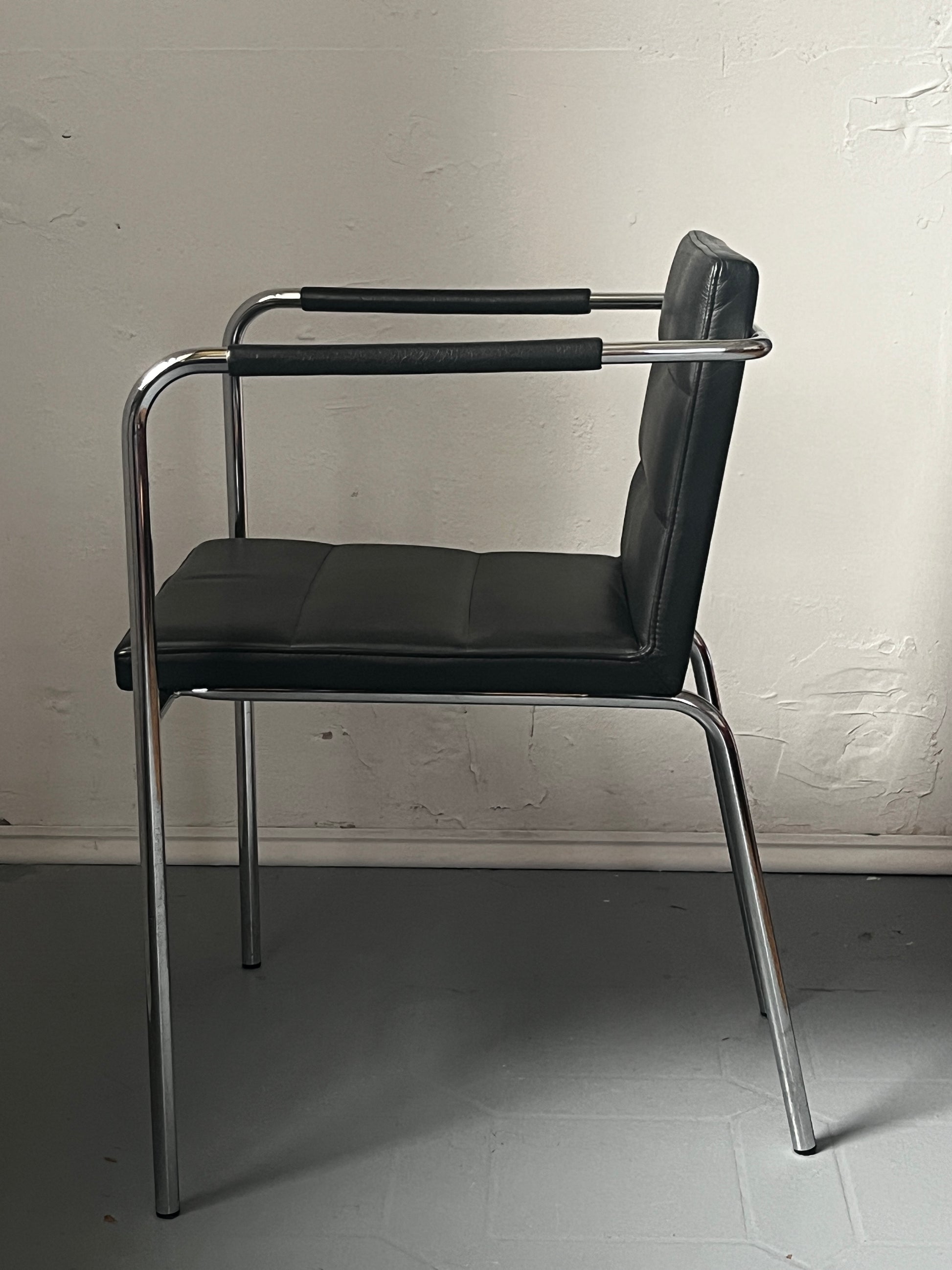 Gunilla Allard Design Sessel Modell Cinema Sport. Schwarzes Leder mit horizontaler Steppung, verchromtes Stahlgestell. Gebrauchter, stabiler, guter Zustand aus dem Jahr 2000, also einer sehr frühen Produktionsphase. Auf der Unterseite gemarkt.