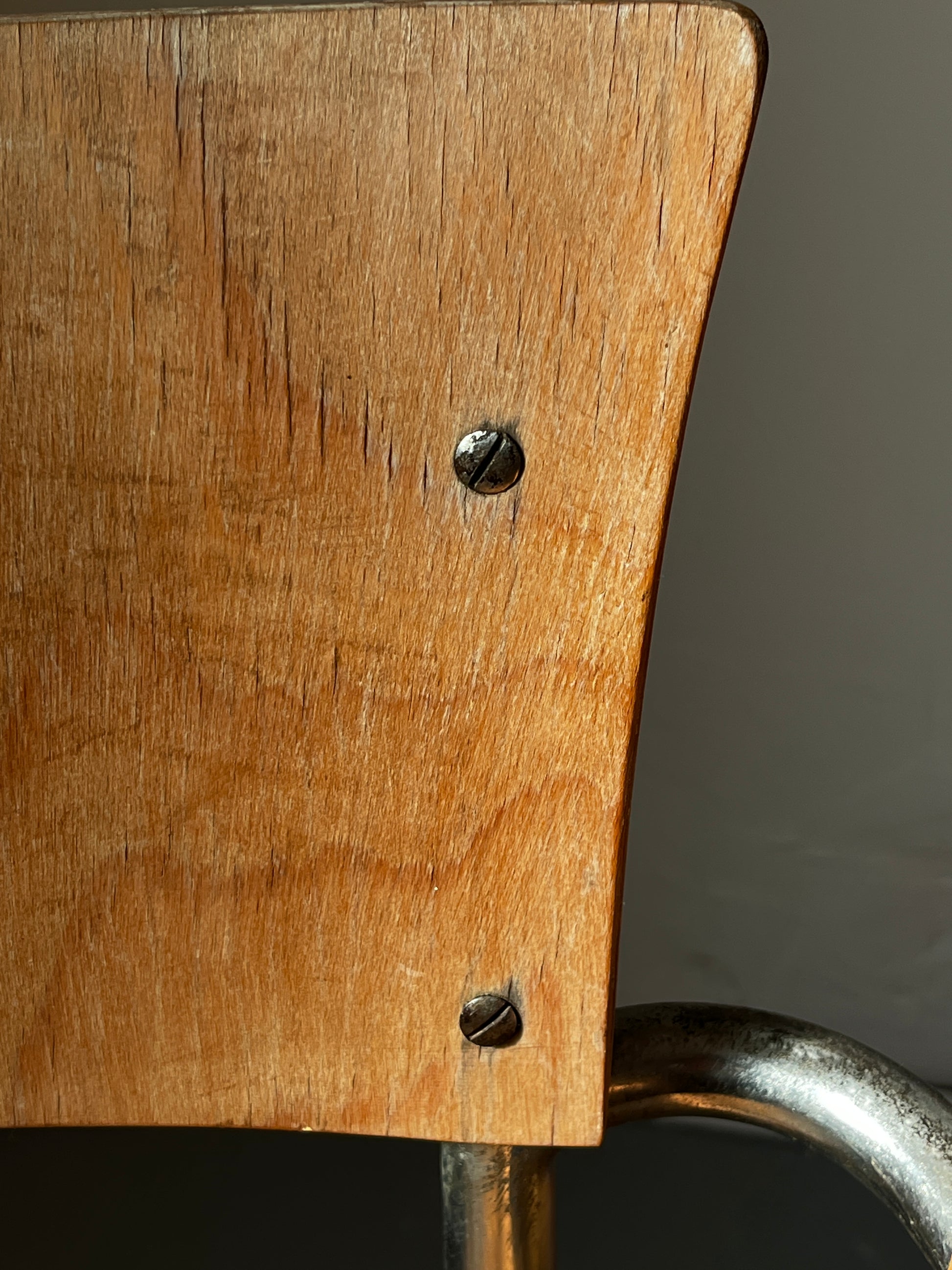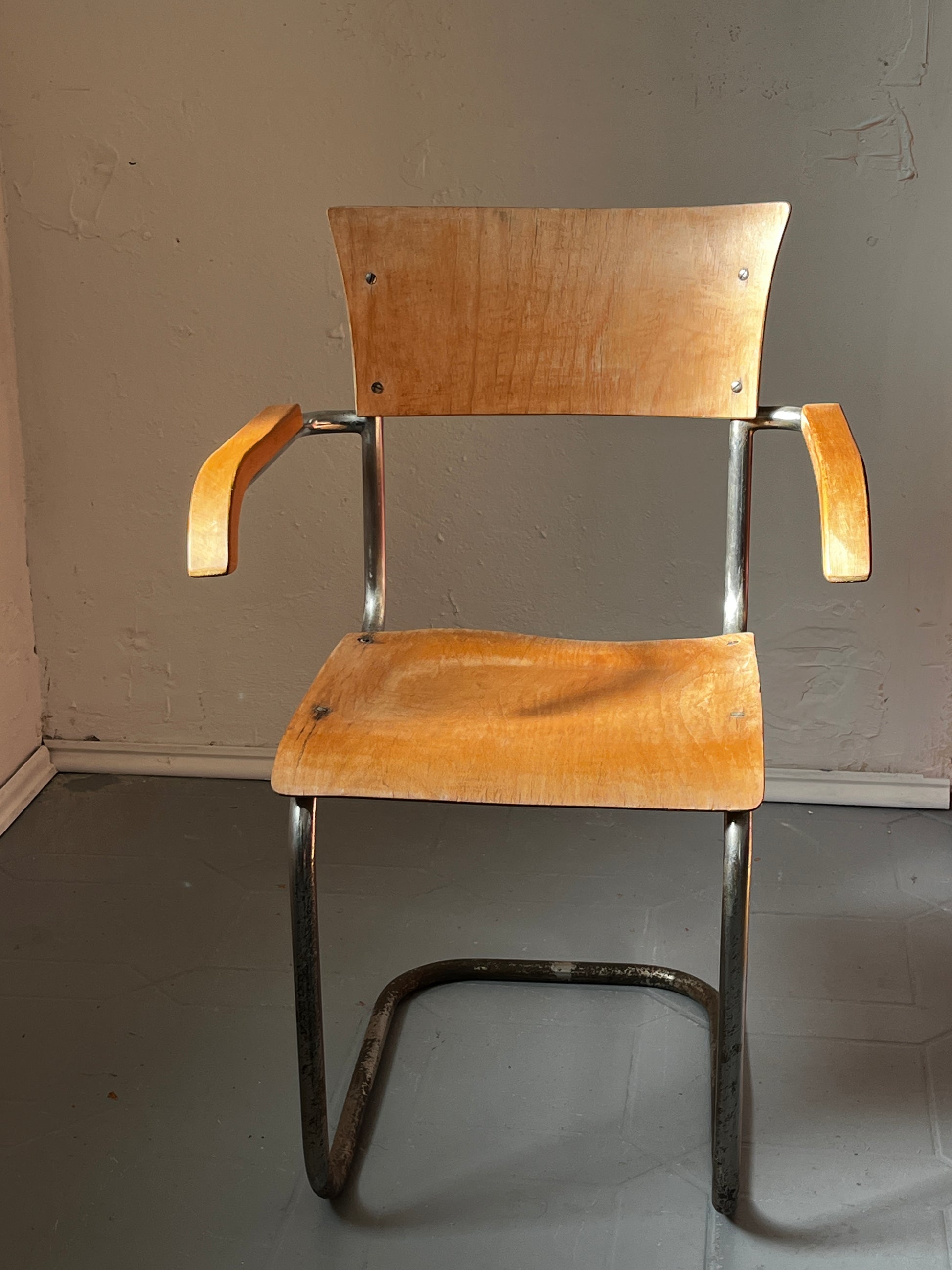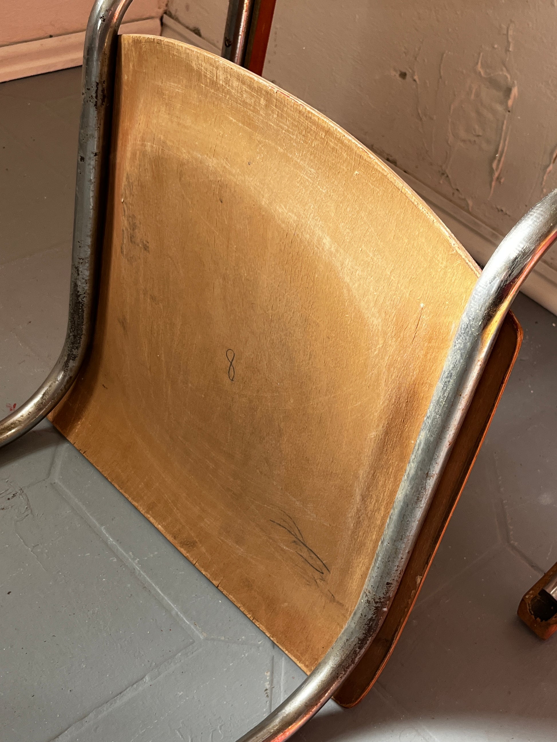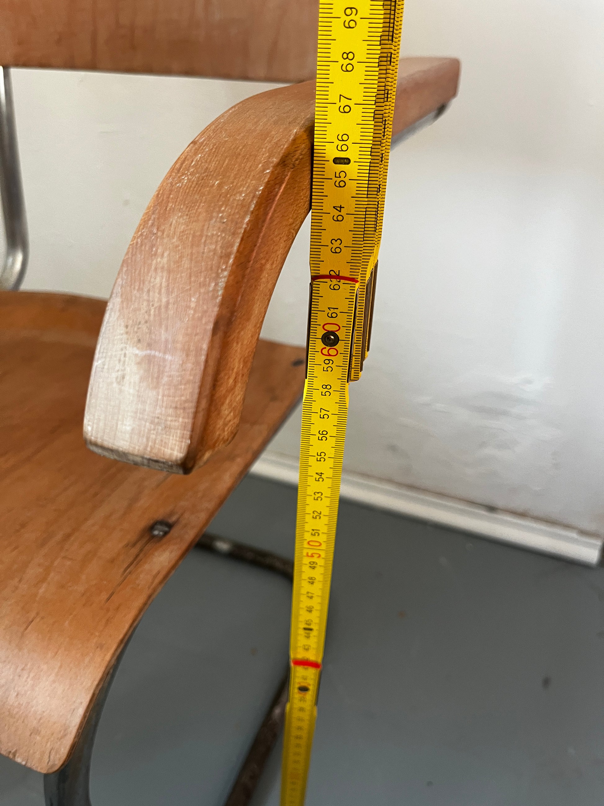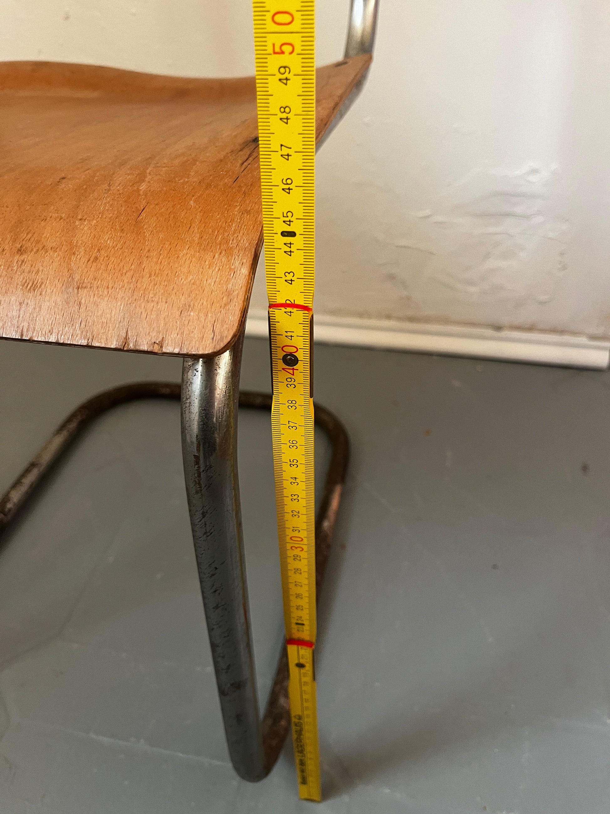 Der Sessel ist stabil und voll funktionsfähig, wurde jedoch bewusst unrestauriert belassen. Am Stahlrohr befinden sich deutliche Gebrauchsspuren und Rostansätze, ebenso zeigen Sitzfläche und Rückenlehne die Patina ihrer Geschichte. Genau diese authentischen Spuren machen jedes Stück einzigartig und erzählen von fast einem Jahrhundert gelebter Designgeschichte.