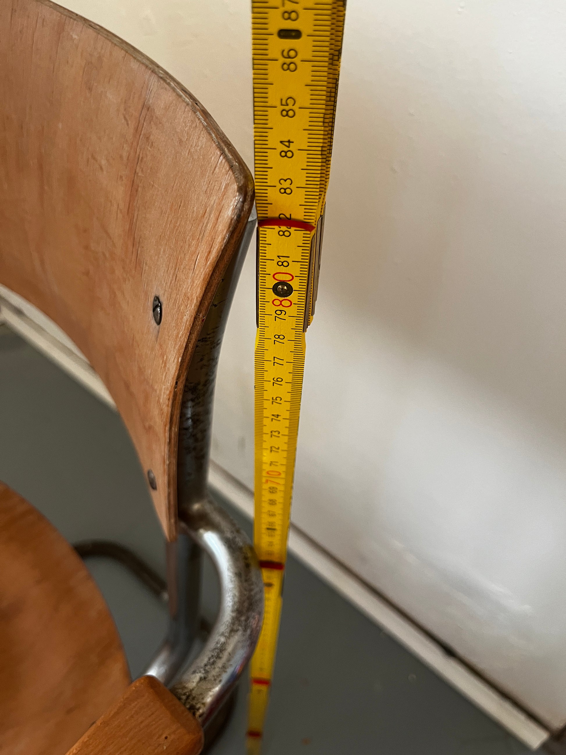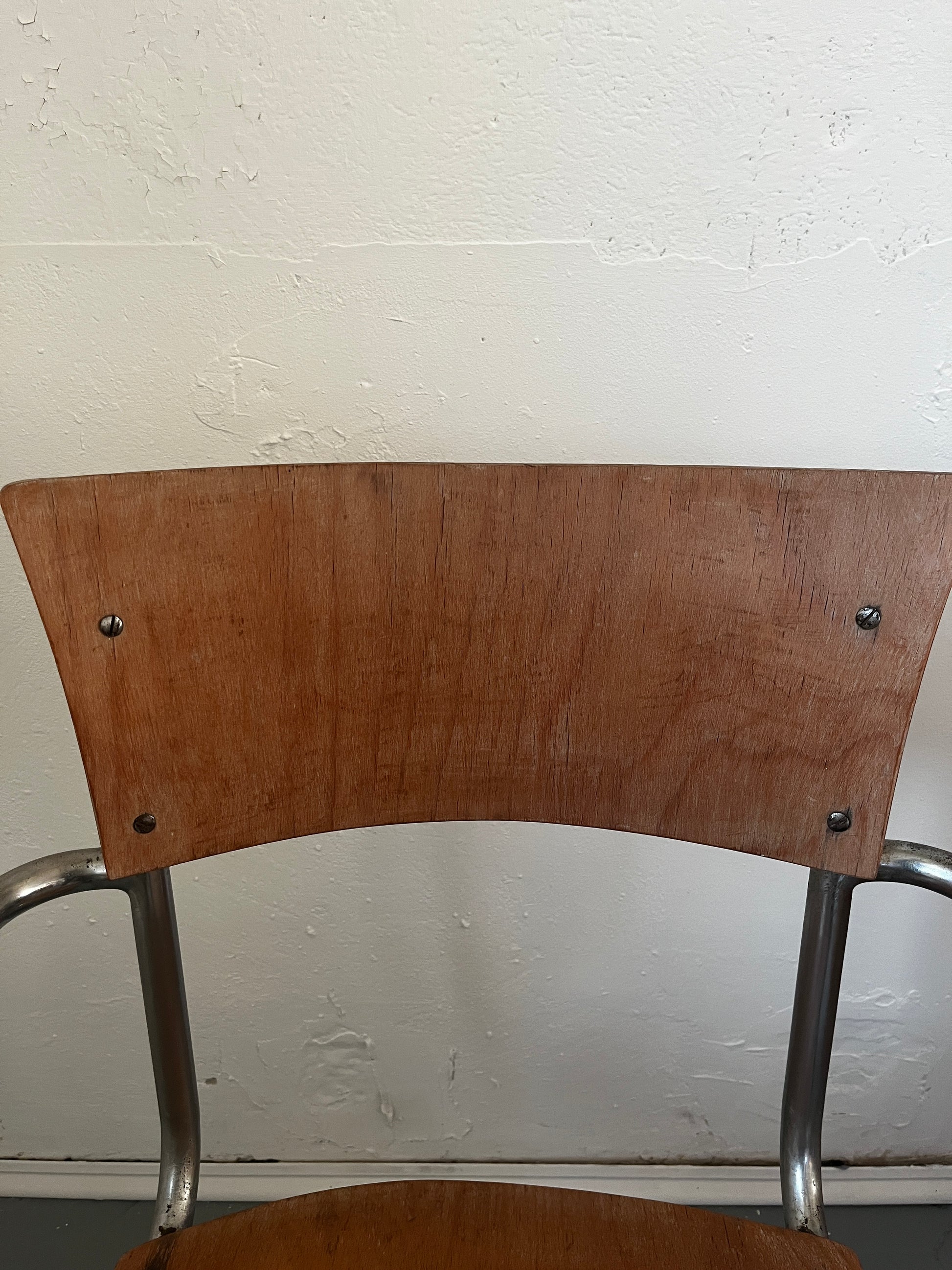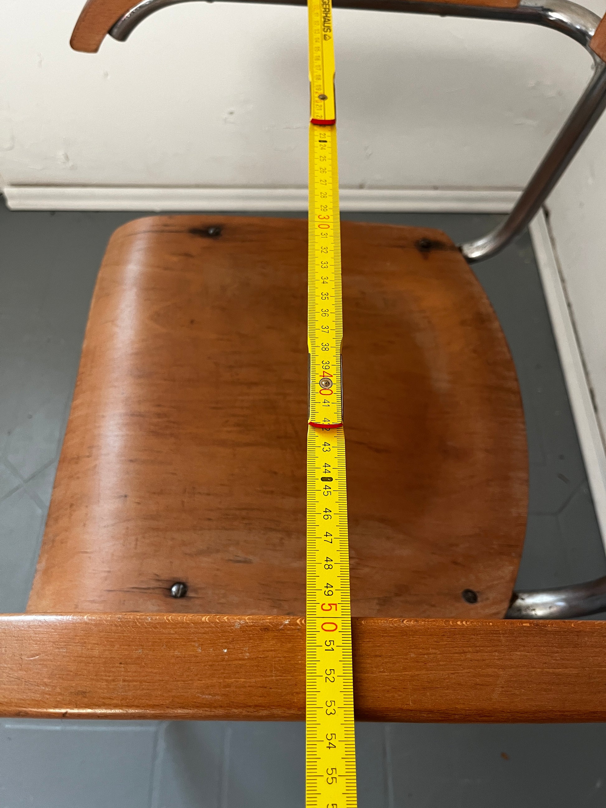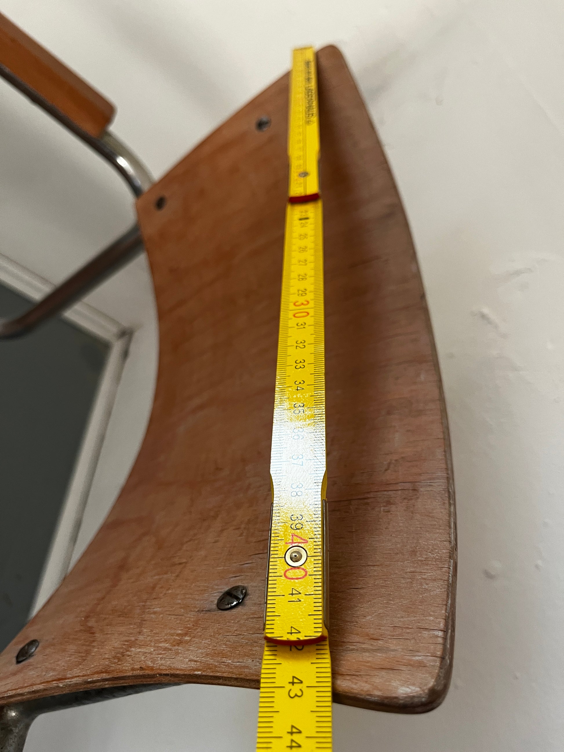 Der Sessel ist stabil und voll funktionsfähig, wurde jedoch bewusst unrestauriert belassen. Am Stahlrohr befinden sich deutliche Gebrauchsspuren und Rostansätze, ebenso zeigen Sitzfläche und Rückenlehne die Patina ihrer Geschichte. Genau diese authentischen Spuren machen jedes Stück einzigartig und erzählen von fast einem Jahrhundert gelebter Designgeschichte.