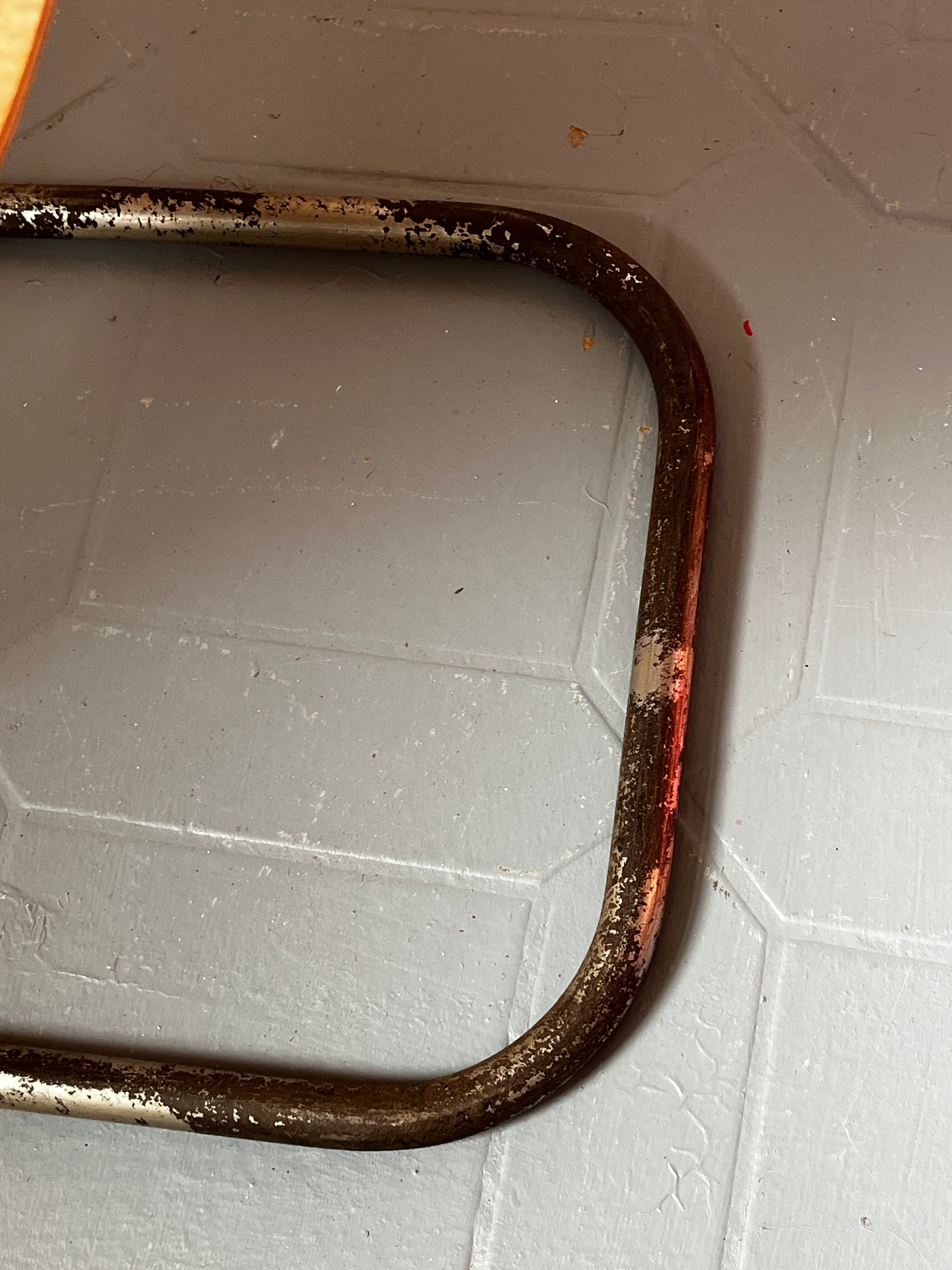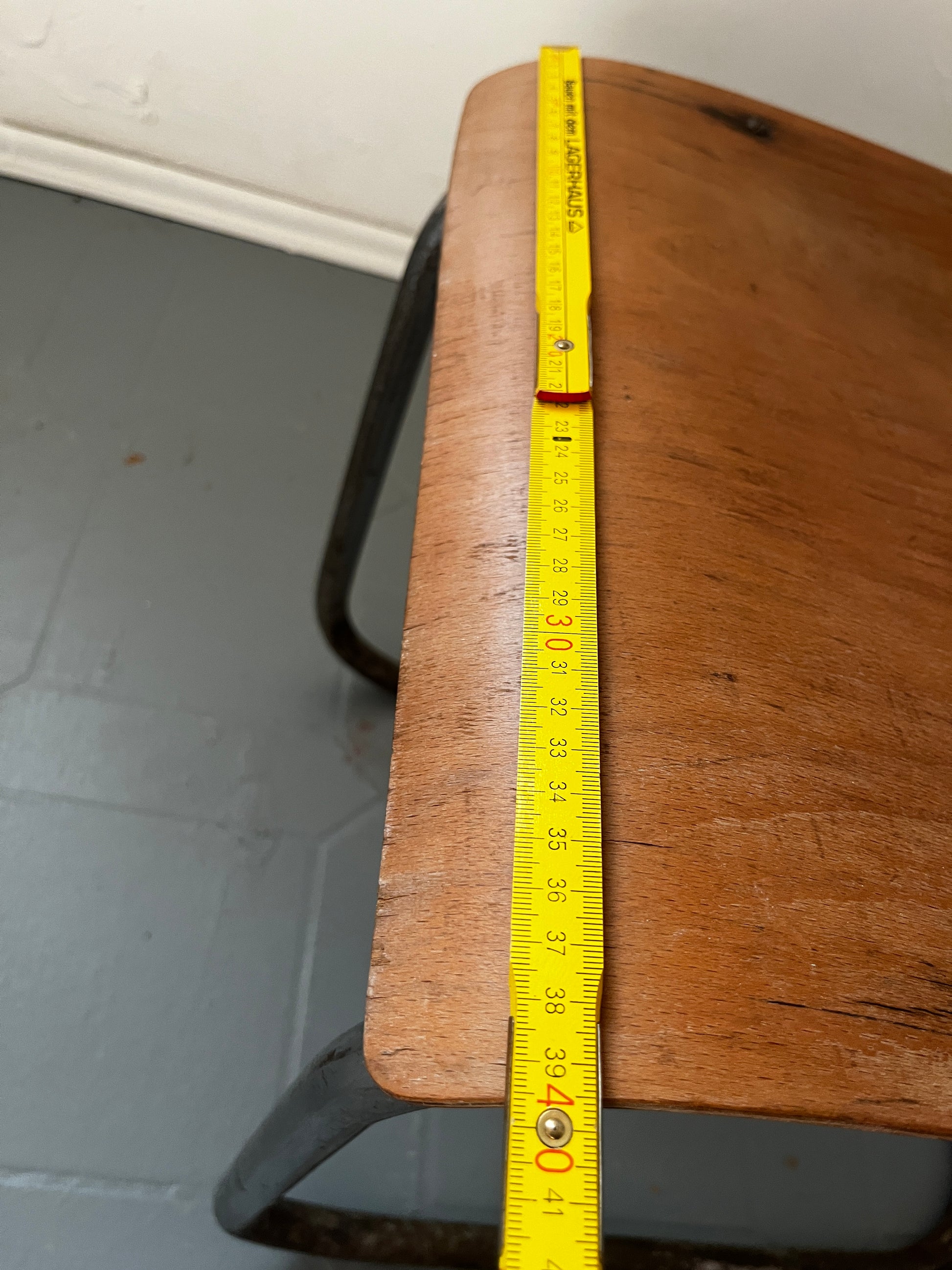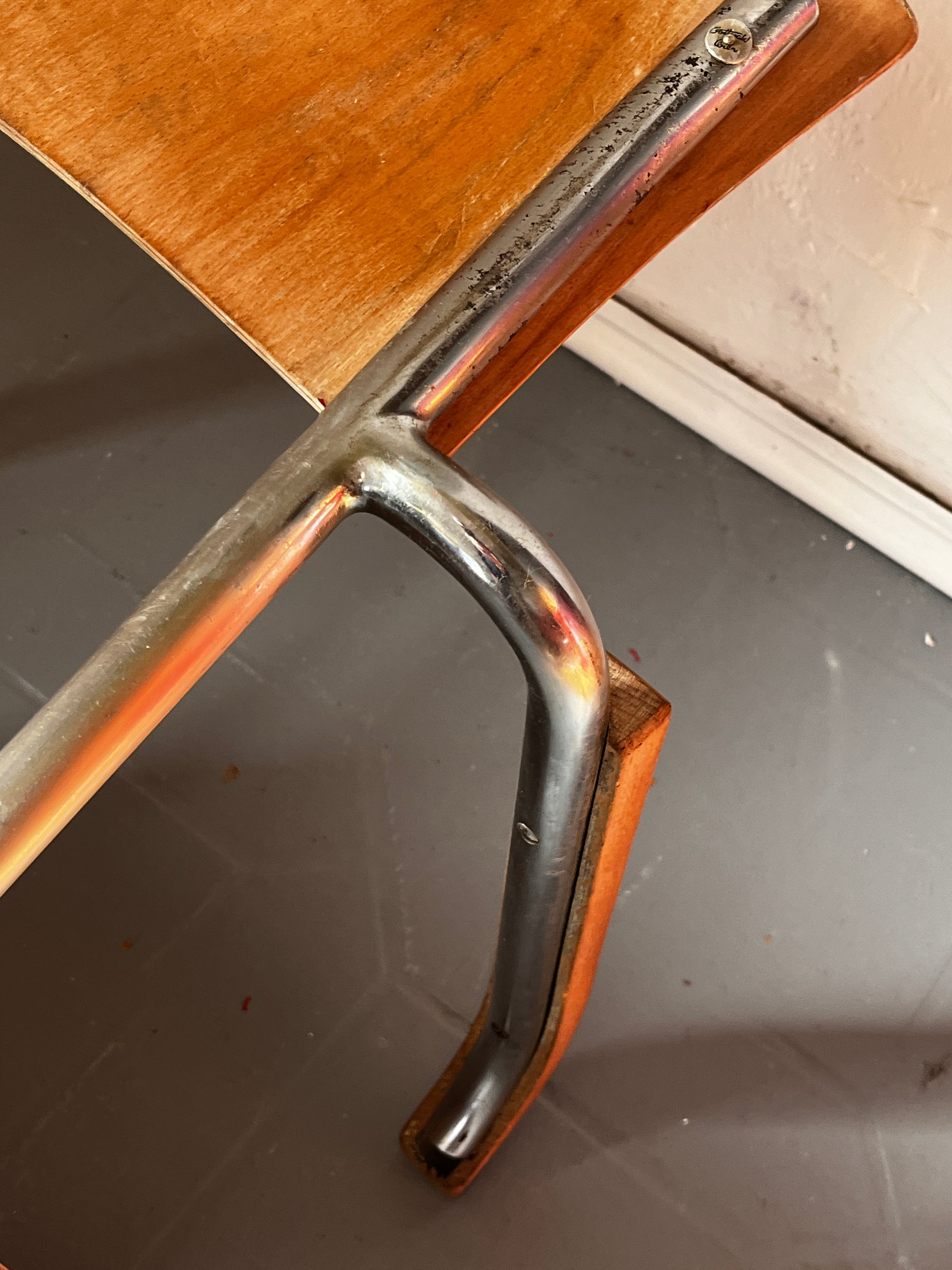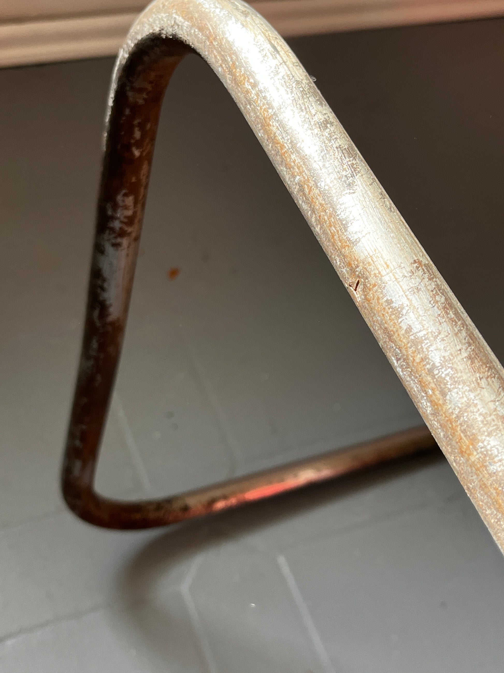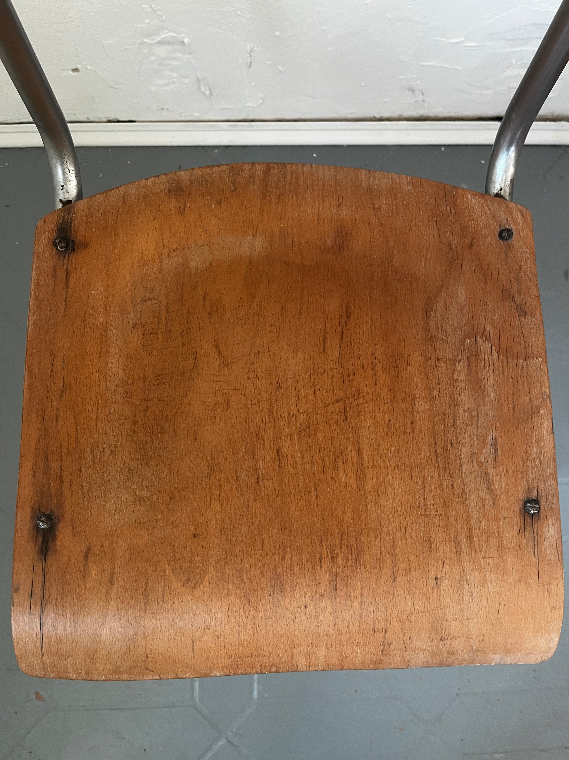 Der Sessel ist stabil und voll funktionsfähig, wurde jedoch bewusst unrestauriert belassen. Am Stahlrohr befinden sich deutliche Gebrauchsspuren und Rostansätze, ebenso zeigen Sitzfläche und Rückenlehne die Patina ihrer Geschichte. Genau diese authentischen Spuren machen jedes Stück einzigartig und erzählen von fast einem Jahrhundert gelebter Designgeschichte.